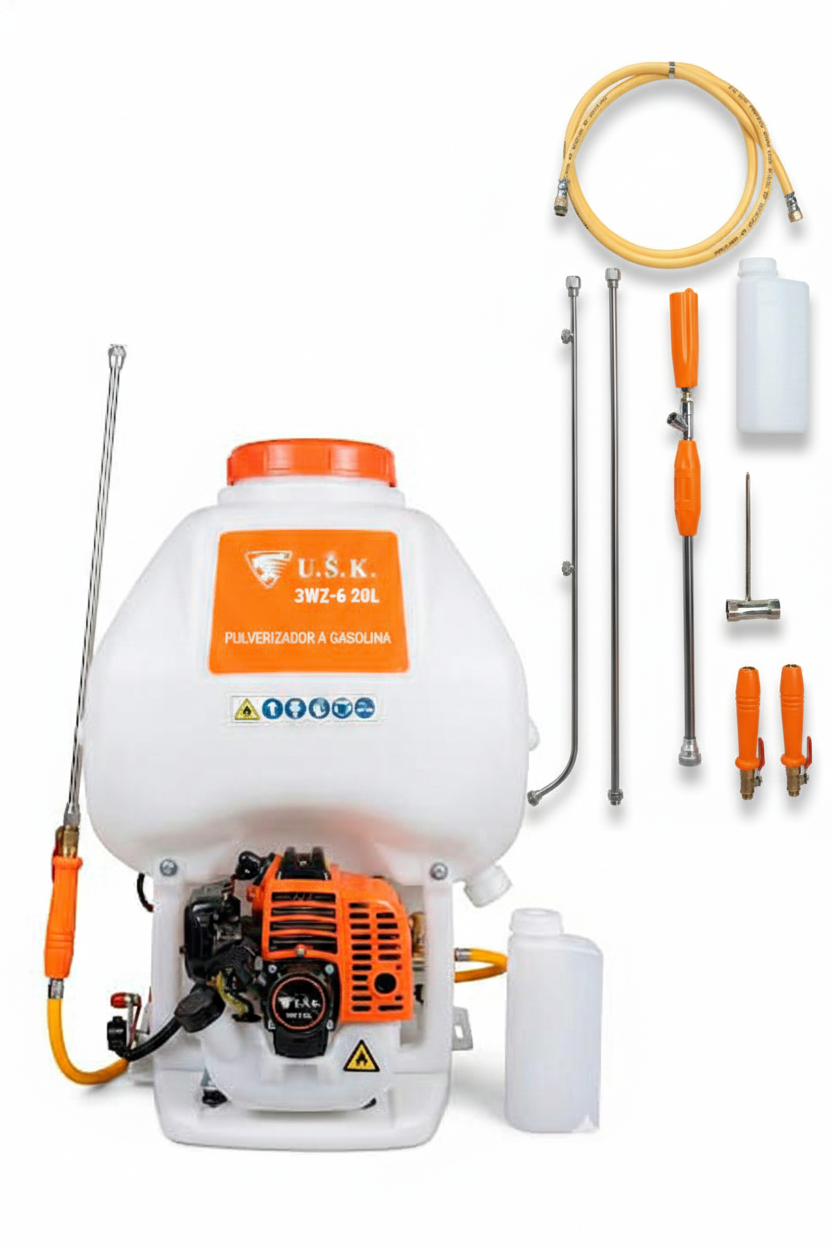 El pulverizador a gasolina USK 3WZ-6 de 20 litros es un equipo confiable y eficiente para la aplicación de productos químicos en agricultura y jardinería. Incorpora un motor de 2 tiempos de bajo consumo, ideal para trabajos continuos que requieren movilidad, autonomía y precisión en la fumigación.